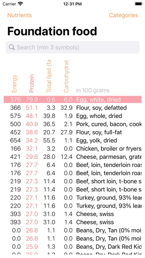 The application allows you to search, filter, sort by nutrient content. Good for finding optimal foods for the diet.