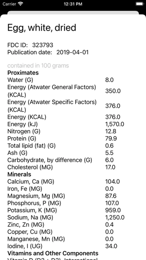 FoodData Central research-focused search app that provides expanded data on nutrients and other foods components.