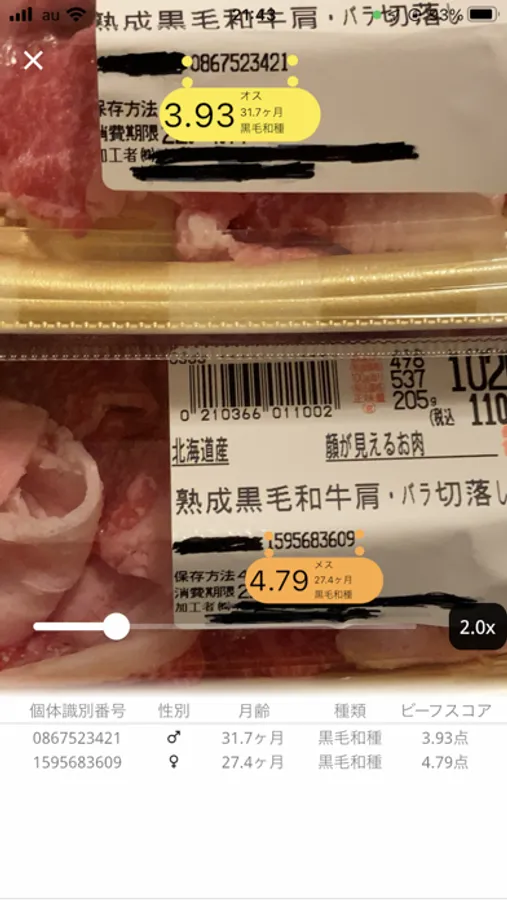 1. スーパーに並んでいる牛肉パックの個体識別番号をBeef Lensのカメラでスキャン