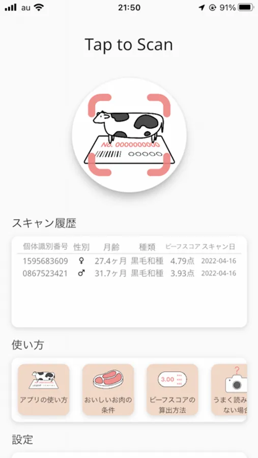 牛の個体識別番号をBeef Lensのカメラで読み取ることで、性別、品種、月齢などの情報と、それらを元に計算したビーフスコアを見ることができます。