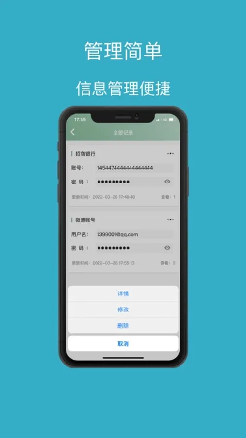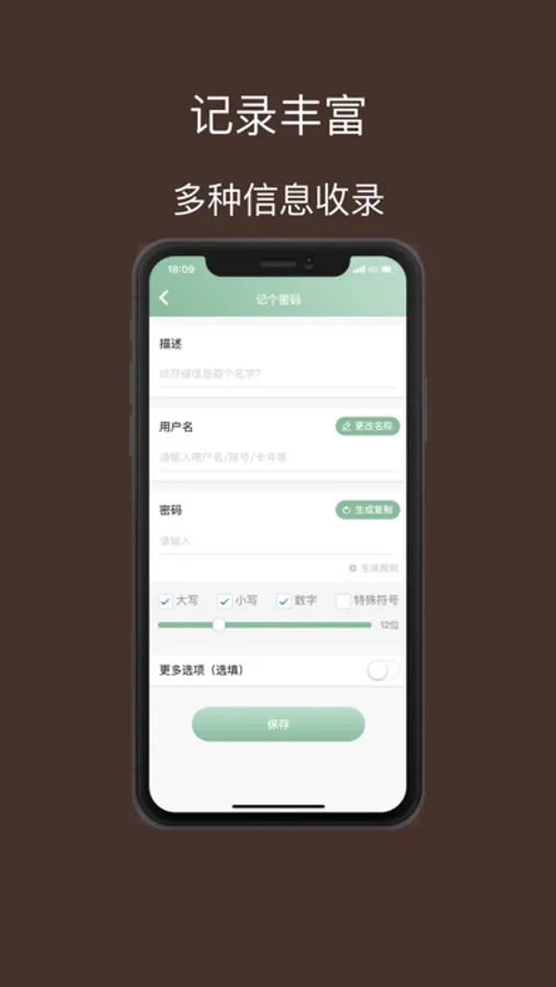 掌上密码本app是一款十分安全的密码管理软件,如果你经常忘记密码,可以使用这款密码备忘本来帮助你储存你的账号和密码,除了经常使用的社交工具,网购APP会员卡信息,还能够将一个信息安全的储存到手机本地,保护你的信息安全,这款安全又简洁的密码管理能够时时刻刻保护你的账号密码。