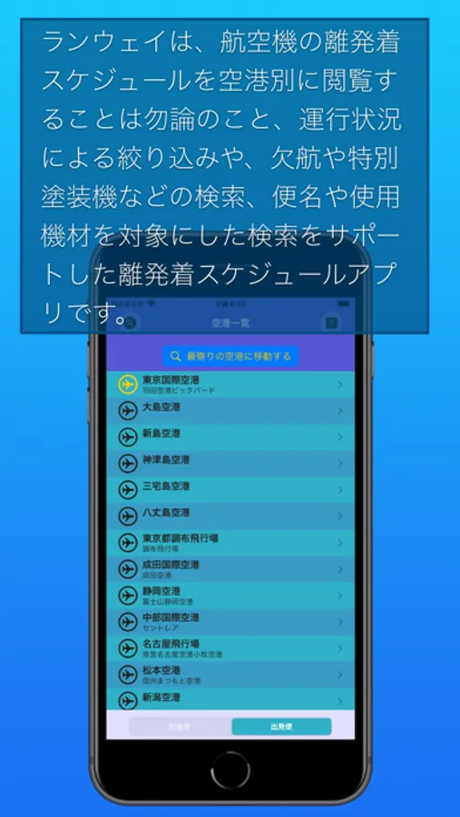 ランウェイは、航空機の離発着スケジュールを空港別に閲覧することは勿論のこと、運行状況による絞り込みや、欠航や特別塗装機などの検索、便名や使用機材を対象にした検索をサポートした離発着スケジュールアプリです。また、各空港の航空気象(METAR)や、出発地や到着地の時間毎の天気予報を確認することも可能です。