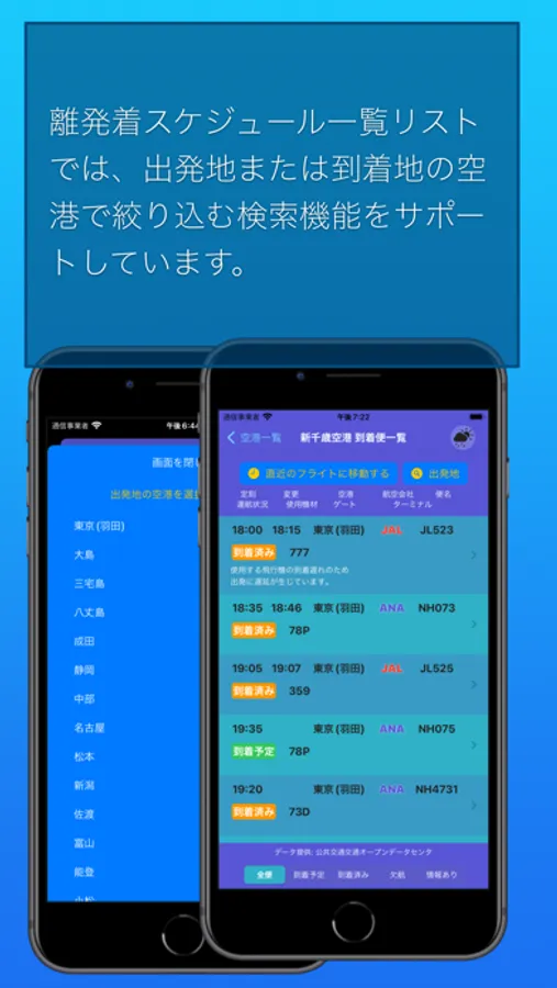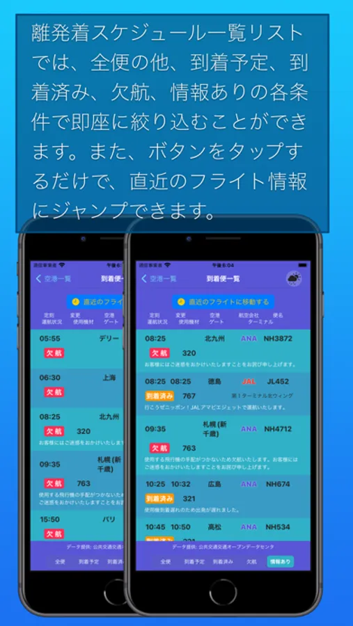 離発着スケジュール一覧リストでは、全便の他、到着予定、到着済み、欠航、情報ありの各条件で即座に絞り込むことができます。また、ボタンをタップするだけで、直近のフライト情報にジャンプできます。