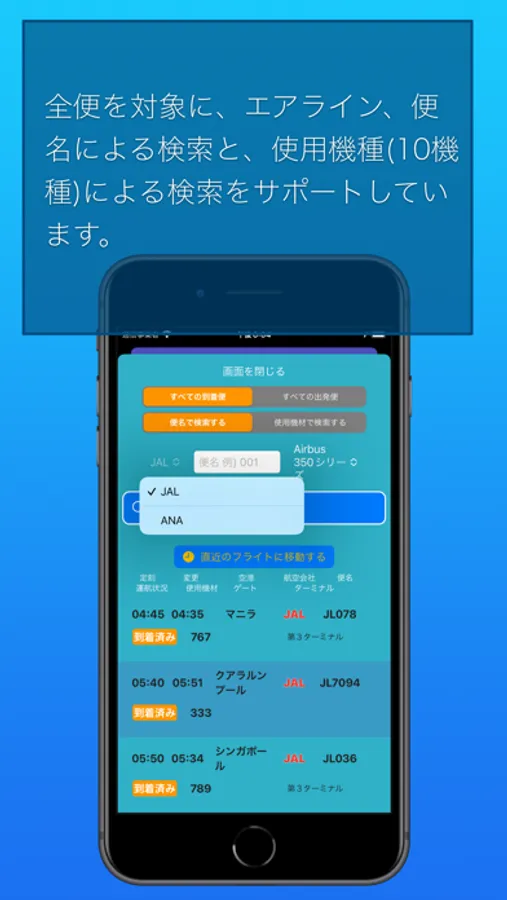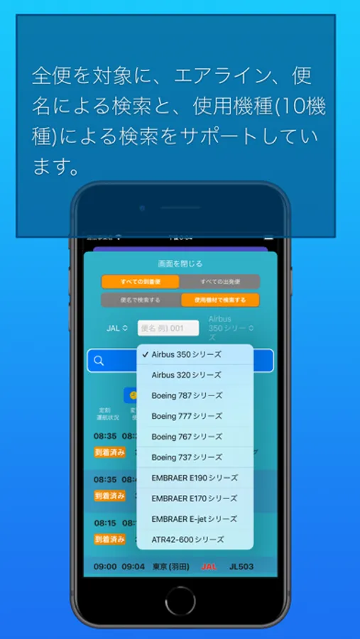 全便を対象に、エアライン、便名による検索と、使用機種(10機種)による検索をサポートしています。