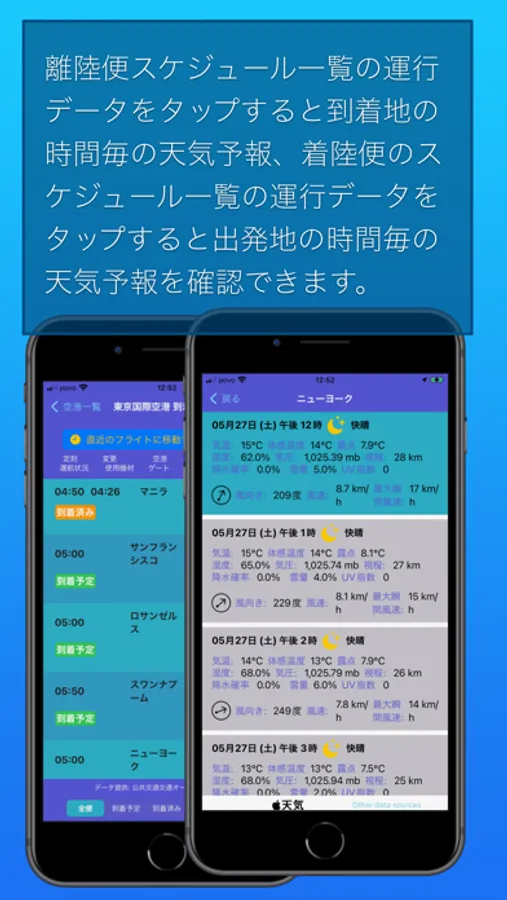 出発便の運航データをタップすると到着地の時間毎の天気予報、到着便の運航データをタップすると出発地の時間毎の天気予報を確認できます。