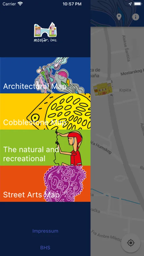 Ova mapa je jedan mali segment umjetničke produkcije Street Arts Festival Mostar (SAFMO) kojeg su mladi aktivisti, umjetnici i kulturni radnici isprva neformalno, a kasnije profesionalno, pokrenuli 2012. godine. Zajednički cilj, no i zajednički problem je bio oplemenjivanje i pomaganje regenerativnog procesa prostora i društva. Kreiranje ulične galerije je suptilni pokušaj da se reinterpretira i stvori nova memorija i atmosfera urbanog života grada i približi umjetnost civilnom životu i mapira Mostar kao grad ulične umjetnosti s jednom od većih i ljepših galerija pod otvorenim nebom u regiji i šire. SAFMO je kroz deset godina djelovanja uspio da se izbori za javni prostor, odgovori na probleme kroz umjetničko izražavanje i u konačnici postane komunikacijsko rješenje koje svakako doprinosi procesu oplemenjivanja društvene zajednice. Multikulturalnost kao važna komponenta ovog Festivala i njegove misije je jedan snažan temelj na kojem se gradila cijela priča. Istražite grad putanjom ovih murala koje su oslikali umjetnici iz cijeloga svijeta.