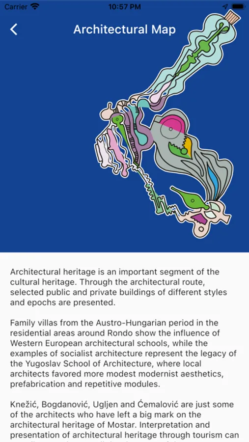 Arhitektonska baština predstavlja bitan segment kulturne baštine. Kroz arhitektonsku rutu predstavljeni su odabrani objekti javne i privatne namjene različitih stilova i epoha. Porodične vile iz Austrougarskog perioda u rezidencijalnim dijelovima oko Rondoa pokazuju utjecaj zapadnoevropskih graditeljskih škola, dok reprezentativni primjerci socijalističke arhitekture predstavljaju naslijeđe jugoslovenske graditeljske škole, gdje su lokalni arhitekti favorizirali skromniju modernističku estetiku, prefabrikaciju i repetitivne module. Knežić, Bogdanović, Ugljen i Ćemalović su samo neki od arhitekata koji su ostavili veliki pečat na arhitektonsko naslijeđe Mostara. Interpretacija i prezentacija arhitektonske baštine kroz turizam može doprinijeti sveukupnom razvoju tih sredina.
