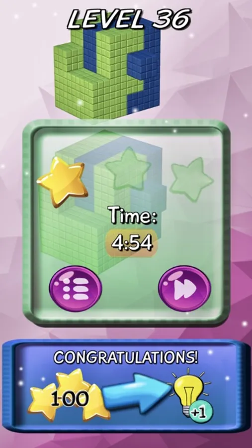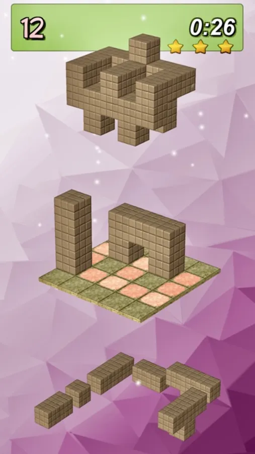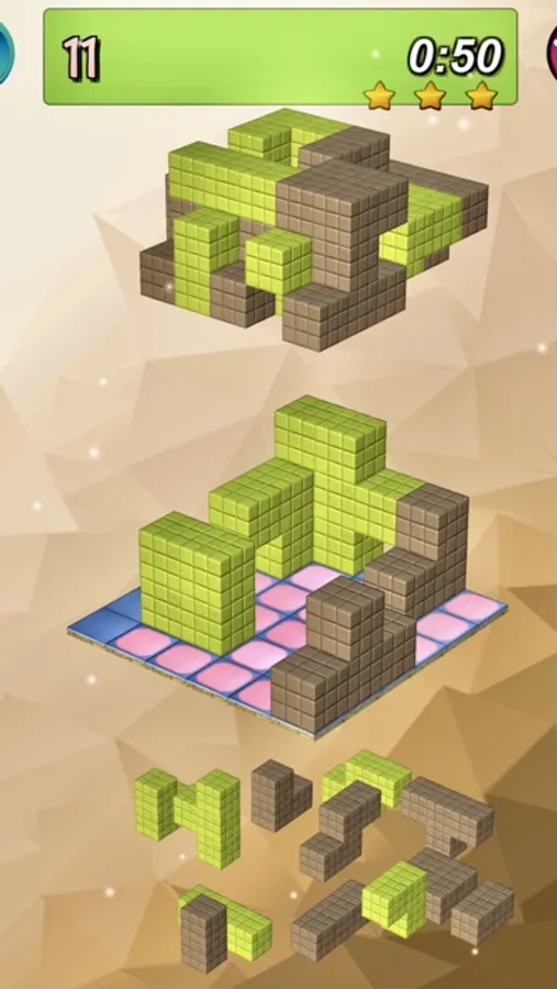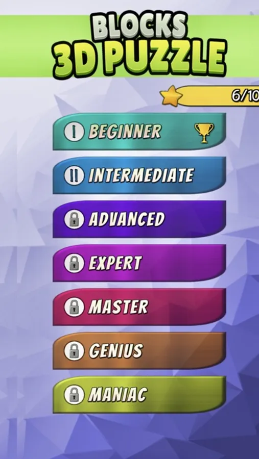 Blocks 3D Puzzle contiene 350 niveles con una dificultad creciente repartidos en varios grados: Beginner, Intermediate, Advanced, Expert, Master, Genius y Maniac.
