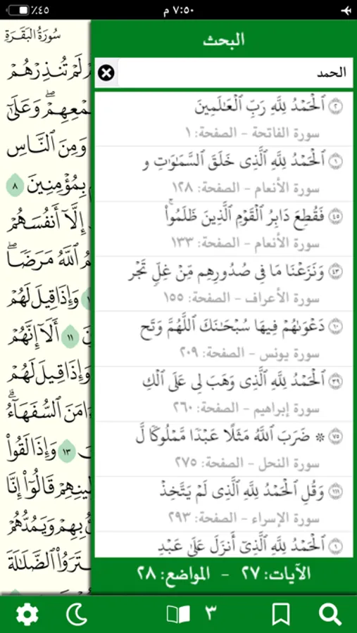 - Quick search service at the level of the verse, the word, or their parts while keeping the results, and displays the search results in the Ottoman script.