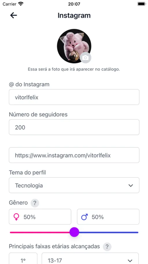 O cadastro é simples e bastante objetivo, você irá preencher com seus dados pessoais e depois informar as métricas alcançadas por seu perfil.