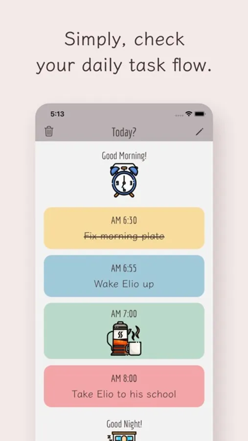 *This app is not a calendar or other schedule management app, but an app for managing the flow of tasks in a day, from waking up to going to bed. If you are looking for a schedule management app, please check LooSche, an app with the same color scheme and design.