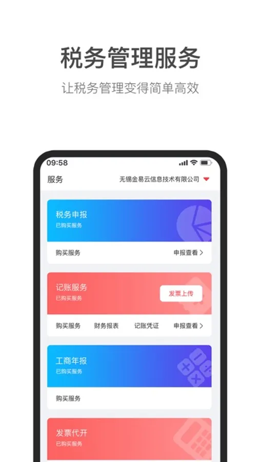 2.税务管理服务:企业可以在app上选择税务申报、记账服务、工商年报、发票代开服务,让税务管理变得简单高效。