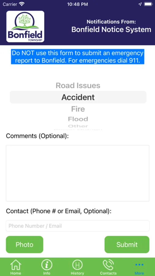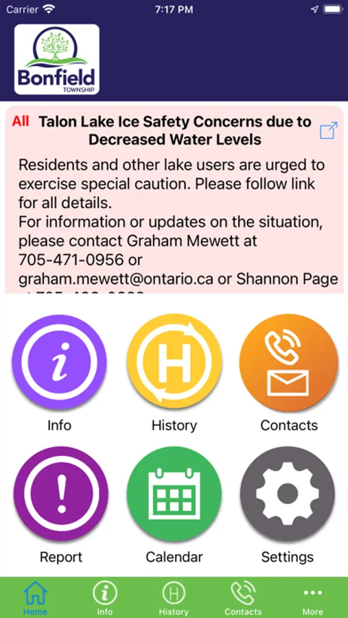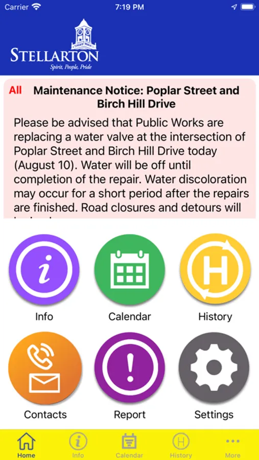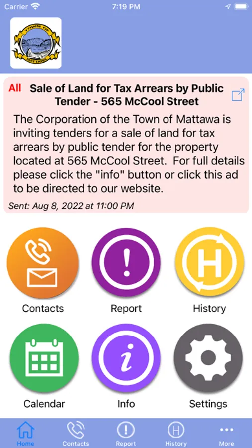 Receive important, interesting information, alerts, notifications on your device, any place, any time from your town. Instantly know the information that is important to you. Select what information you want using the settings page. A very simple interface allows you to see current alerts plus a history of older alerts. Use the home page buttons to receive your news, calendars, event information, etc. You can also send your town important information such as street lights our using the report page.