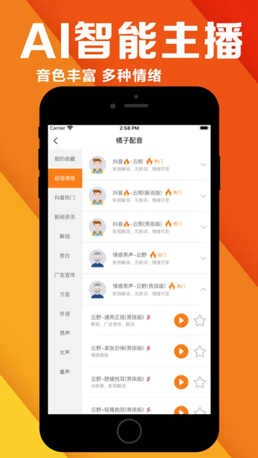 300+AI intelligent emotional voice, including the popular Douyin anchor timbre, dialect, children's voice, foreign language, male voice, female voice, etc