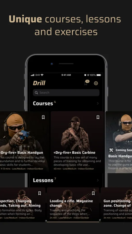 A pistol and carbine training program are available in the app, constantly expanding and updating with new drills. We are actively working on launching courses for other firearm types.