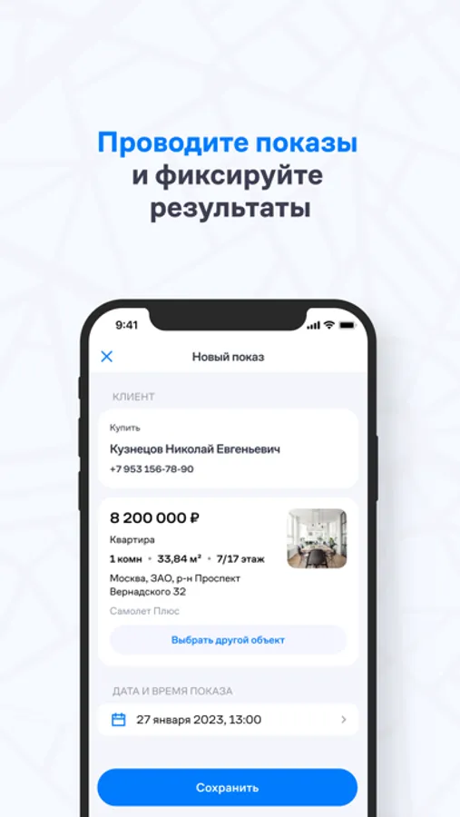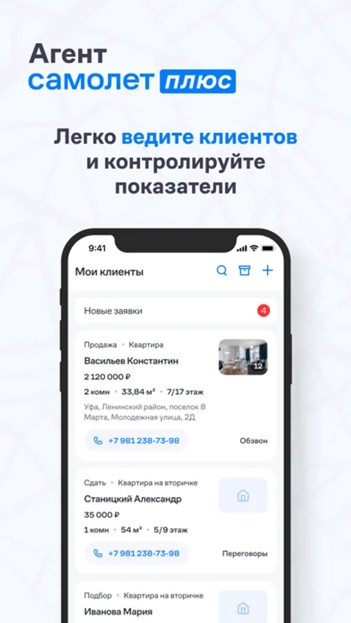 Мобильное приложение агента оператора услуг «Самолёт Плюс». Добавляйте клиентов, создавайте и ведите сделки, подбирайте объекты недвижимости, добавляйте новые объекты в базу. CRM агента всегда под рукой, а подбор объектов максимально удобный.