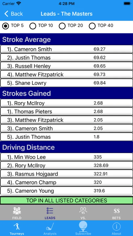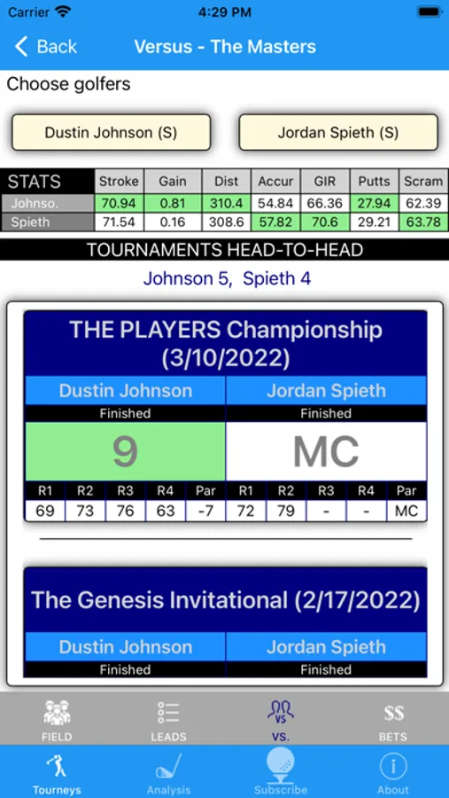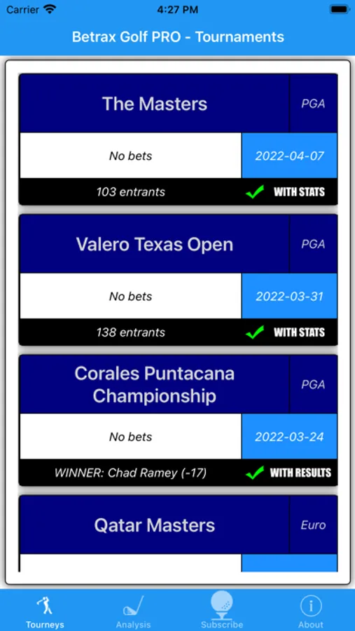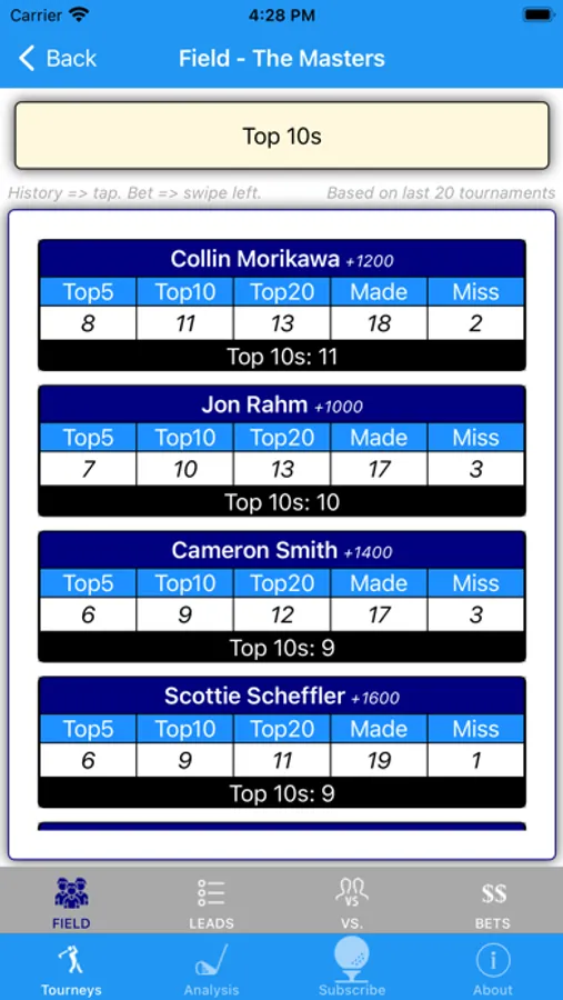 Betrax Golf provides the pro golf bettor with advanced handicapping tools for daily fantasy (DFS) playing or traditional wagering. The app presents upcoming tournament information for the field of golfers, from recent performances to statistical rankings. But more than the information, the app's value comes from the efficient presentation of information to assist betting handicappers in their selection(s).