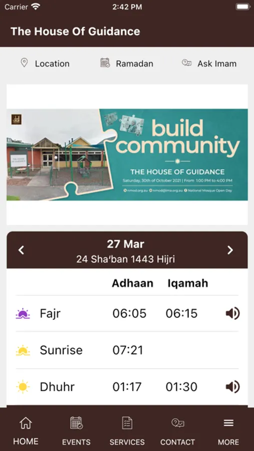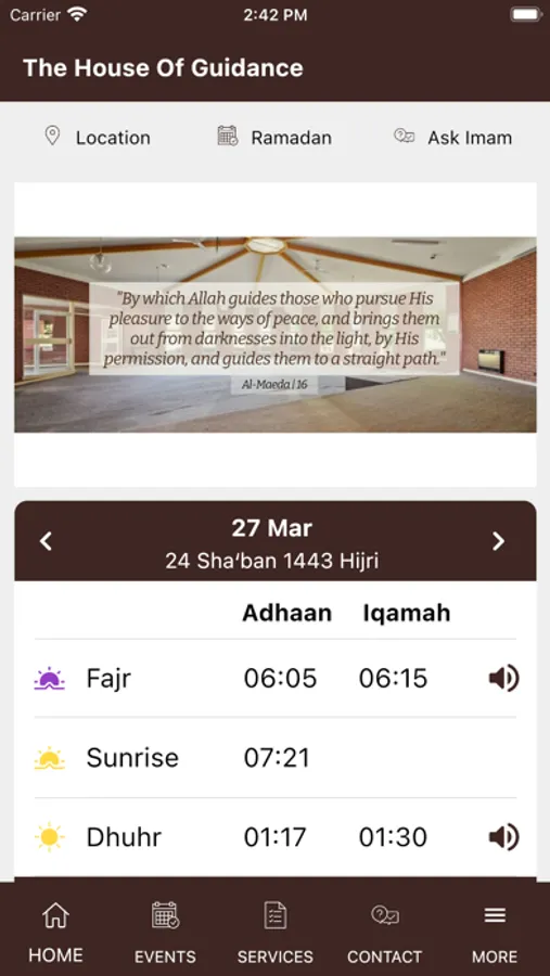 The Centre consists of the main Musallah (prayer hall) which can accommodate up to 300 people, a large, private Muslim Sisters Musallah and a separate multifunction hall which is currently used for education purposes (Madrasah), library (children and adults), children’s play areas (outdoor and indoor). Additionally, Al-Maidah kitchen is available for catering and Community events.