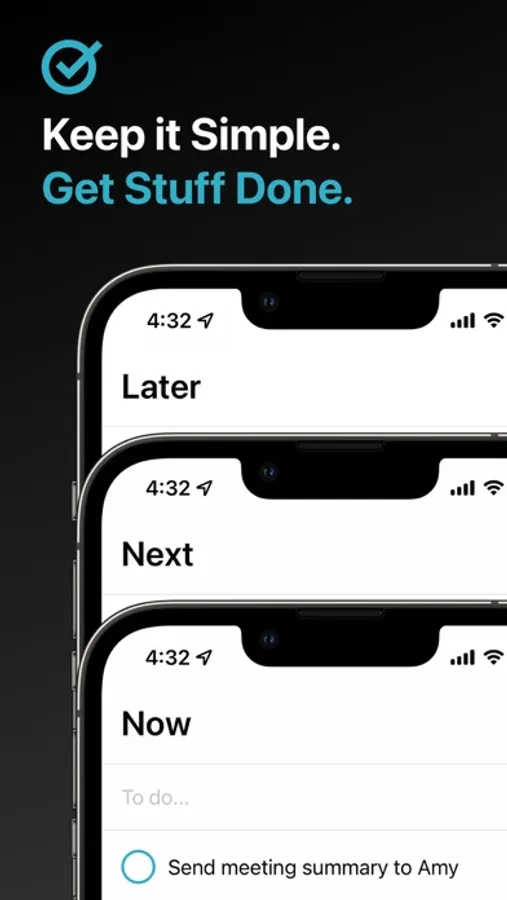 There are three lists: now, next, and later. Add your tasks, check them off, and move them around as you see fit.