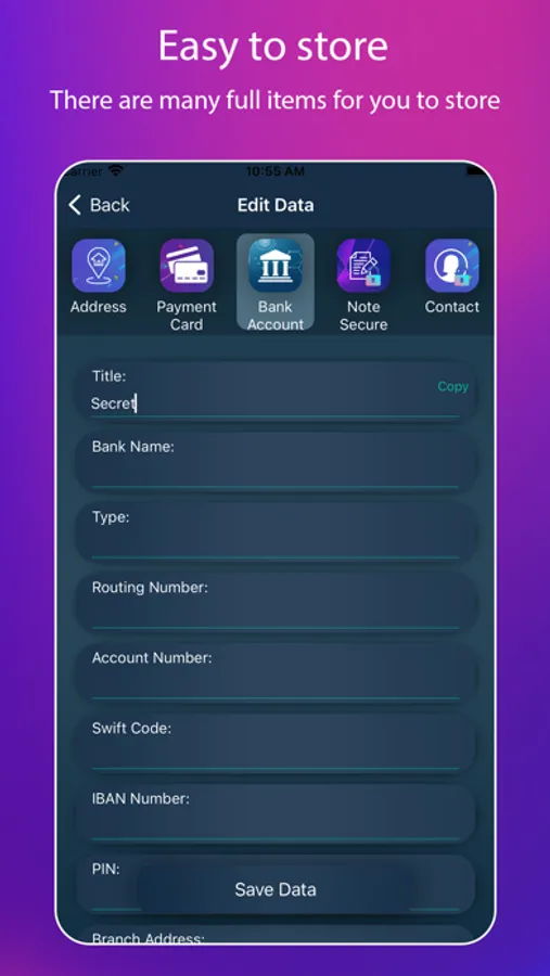 - Confidential information data (bank, account, notes, address, contact...)
