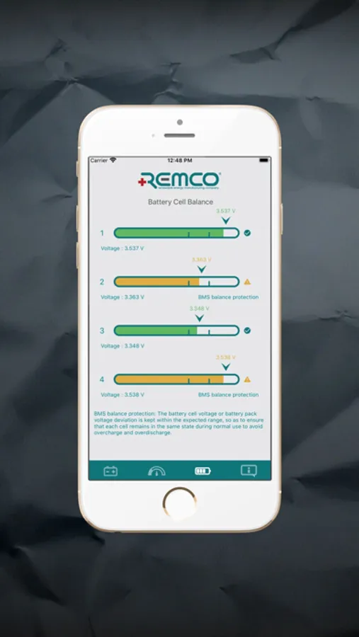 REMCO intelligent battery management system and active equalizer through bluetooth connection, realize to monitor battery status, real-time collecting the information in the storage, processing, battery operation process, the exchange of information with external equipment, to solve the safety of the lithium battery system, ease of use, and the service life of the key problems, achieve prolong the service life of batteries, to improve the stability of the battery after the group.