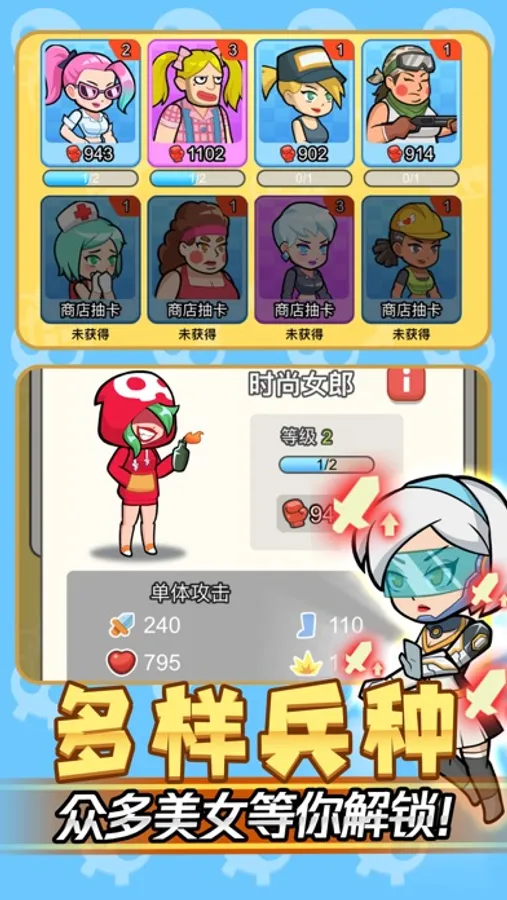 招募队员,指挥许多小姐姐作战,每个小姐姐都有自己独一无二的特点哦