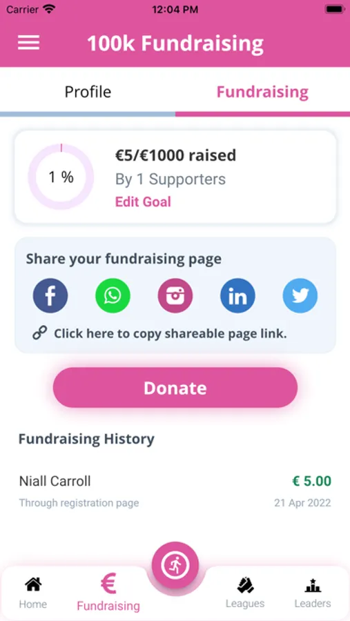 The 100k in 30 Days app helps you track your progress from the Event in aid Marie Keating Foundation. Starting on June 1st you can track your KM’s, join or create leagues and track / promote your fundraising page.