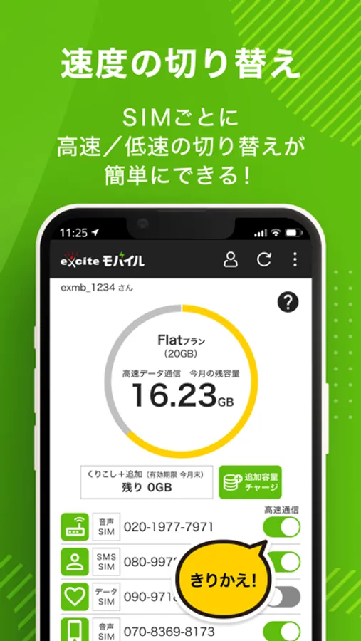 データ使用量や高速データ通信の切り替え、マイページの確認ができます。