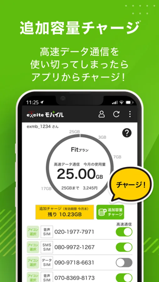 当月の高速データ通信を使い切った場合、追加容量チャージボタンから追加の高速データ通信容量を購入いただけます。