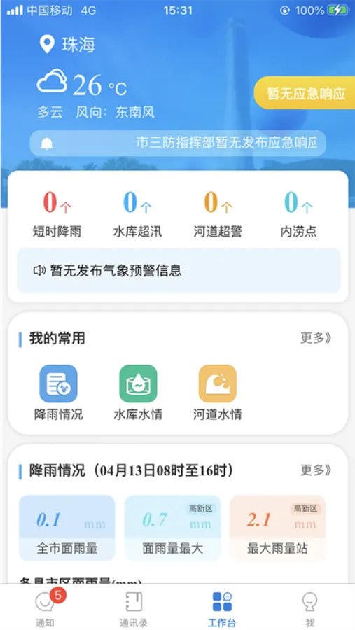 落实水旱灾害防御各单位在灾害防御过程的协同,保障信息上传下达的规范、及时,优化功能界面,补充感知监测数据展示及基础信息数据展示,主要有雨情、水情、工程工况等。
