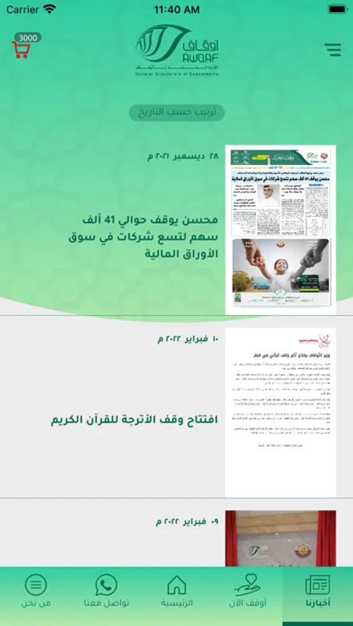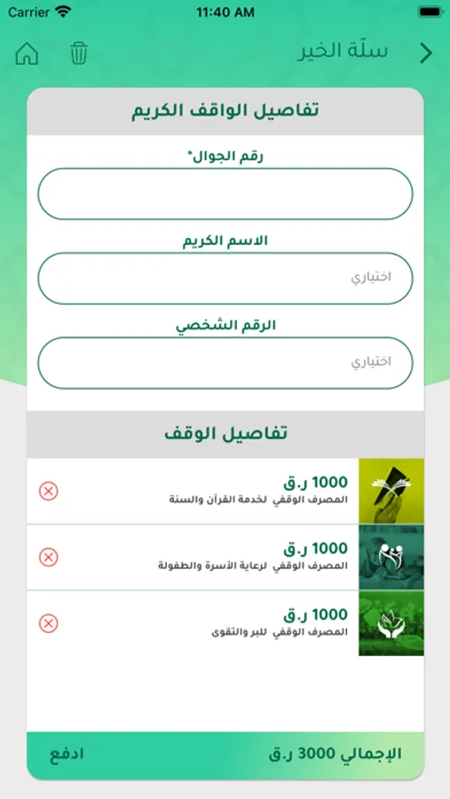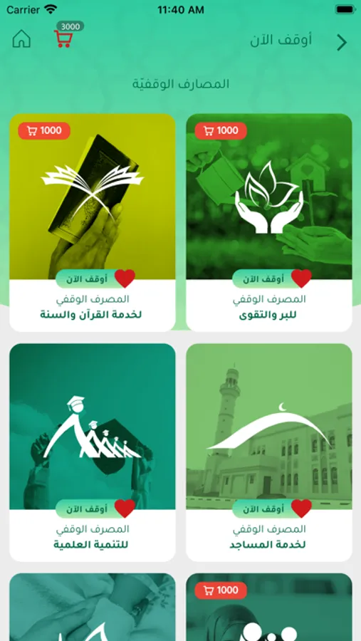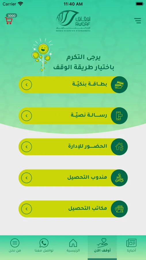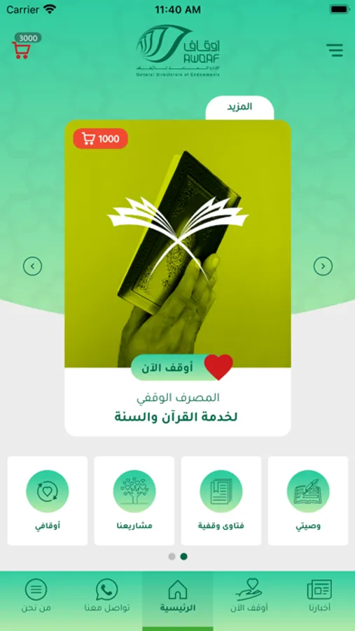 1. Donate now services, which allow making wqaf via (Credit card, SMS, Attend request, collector request and view nearest collection points)