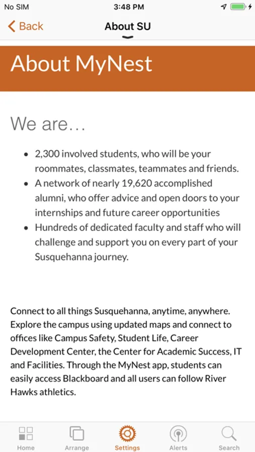 Connect to all things Susquehanna, anytime, anywhere. Explore the campus using updated maps and connect to offices like Campus Safety, Student Life, Career Development Center, the Center for Academic Success, IT and Facilities. Through the myNest app, students can easily access Blackboard and all users can follow River Hawks athletics.