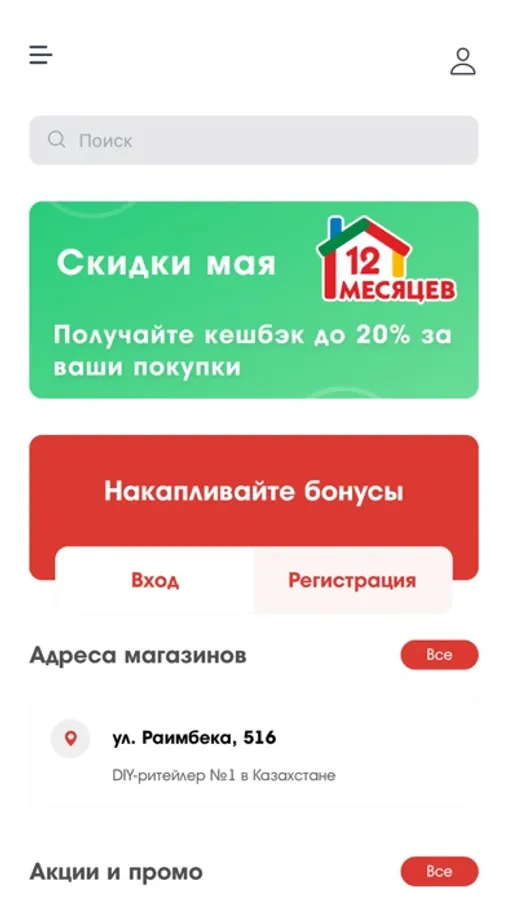 Мобильное приложение для строительного магазина. В данном мобильном приложении действует Программа Лояльности. За каждую совершенную покупку на кассе в магазине пользователю начисляется соответствующий процент бонусов. Также пользователь может ознакомиться с актуальными Промо и Акциями магазина.