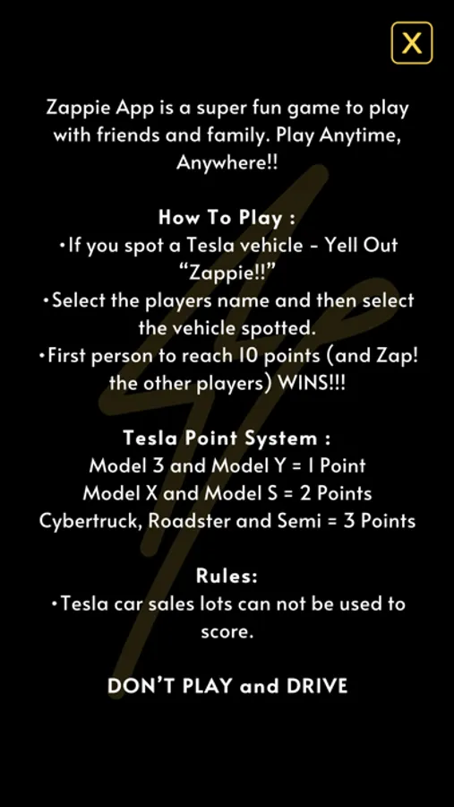 Hey Tesla Fans! Zappie App is a super fun game to play with family and friends. Play Anytime, Anywhere!!