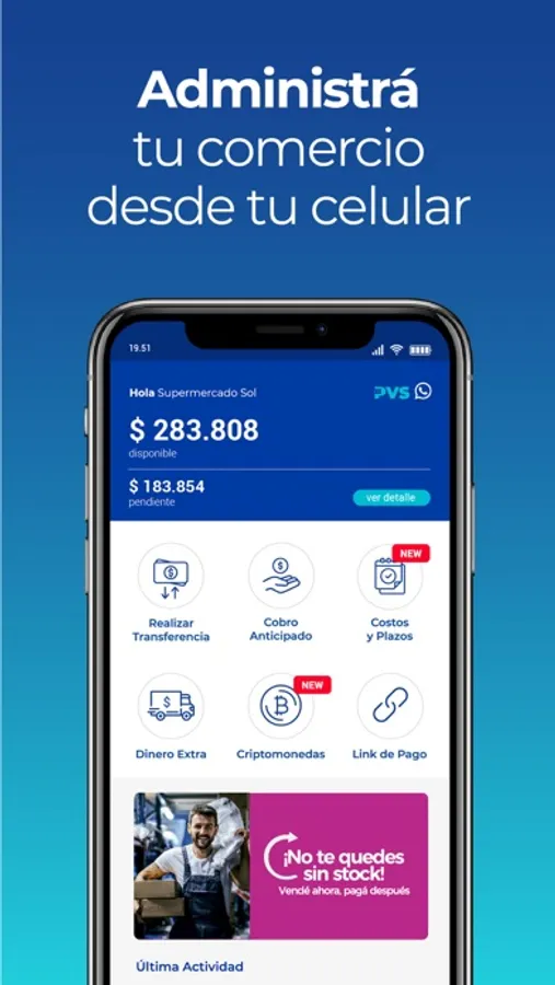 PVS Comercios es una app que sirve para poder administrar las ventas que tu comercio realiza con cualquier medio de pago. Ofrece la posibilidad de transferir los fondos, administrar proveedores y establecer todo tipo de estadísticas sobre tu comercio.