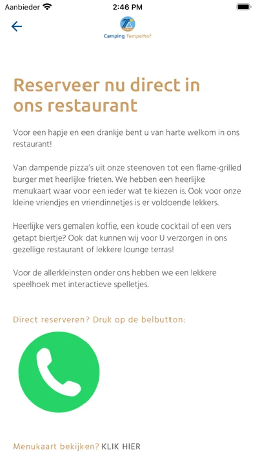 Camping Tempelhof, kamperen in Callantsoog. Onze 5-sterren camping in Callantsoog, Noord-Holland, ligt op zo'n 1500 meter van het strand en beschikt over bijzonder veel faciliteiten. Het hele jaar door kunt u dan ook bij ons terecht. Van overdekt zwemmen tot overdekt sporten, klimwand, sauna, restaurant, diverse speeltuinen en nog veel meer: onze voorzieningen zijn eindeloos!
