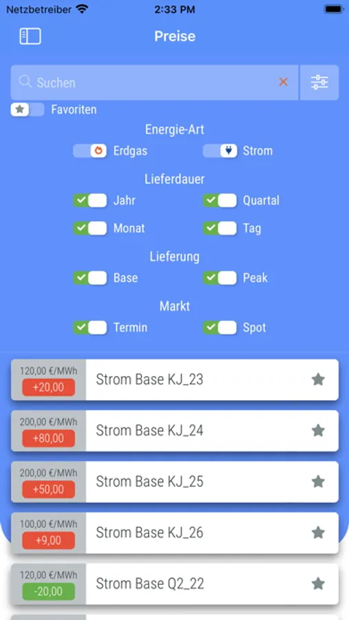 Gezeigt werden dabei von den Terminmärkten Jahres-, Quartals- und Monats-, sowie Base- und Peakprodukte für Strom und Gas, und vom Spotmarkt die Notierungen der Day-Ahead-Auktionen.