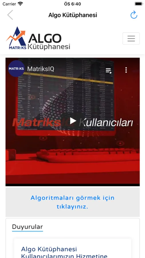 Algo Kütüphanesi, MATRİKS BİLGİ DAĞITIM HİZMETLERİ A.Ş. tarafından 2022 yılında kullanıcılarımızın hizmetine açılmıştır. Algo Kütüphanesi; Matriks veri terminali ve MatriksIQ veri terminalinde kullanılabilinecek algoritmik işlem stratejileri, indikatörler ve taramaların bulunduğu dijital bir kütüphanedir. Bu dijital kütüphanenin kuruluş amacı; piyasada popüler olan, beğenilen ve kendini kanıtlamış indikatörleri, taramaları ve stratejileri kullanıcılarımıza hızlı ve kolay bir şekilde ulaştırmak, kodlama bilgisi az olan veya hiç kodlama deneyimi olmayan kullanıcılarımıza aradıkları indikatörleri, taramaları ve stratejileri kullanımlarına sunmaktır.