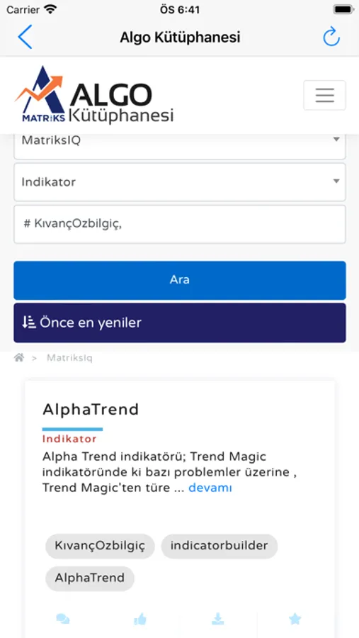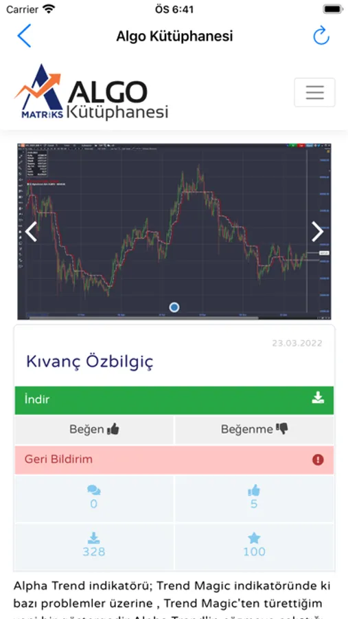 Algo Kütüphanesine eklenen sistemleri kolaylıkla indirebilir, MatriksIQ veri terminali veya Matriks veri terminali ile ilgili sistemleri düzenleyebilir, stratejilerinize uyarlayabilirsiniz. Sistemlerin yer aldığı detay sayfasında, eklenen sistemle ilgili görüşlerinizi paylaşabilir, beğenebilir veya beğenmeyebilirsiniz.Beğen/beğenme sayısına göre detay sayfasında ve algoritma listeleme sayfasında oluşan puanlamayı görebilirsiniz. Algoritma listeleme sayfasında filtreleme yaparak aradığınız algoritmik işlem stratejisine, indikatöre veya taramaya kolaylıkla ulaşabilirsiniz. Filtreleme alanında anahtar kelimeler ile eşleşen sistemlere daha kolay erişebilirsiniz.