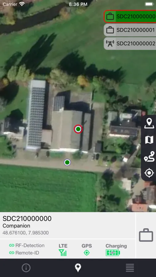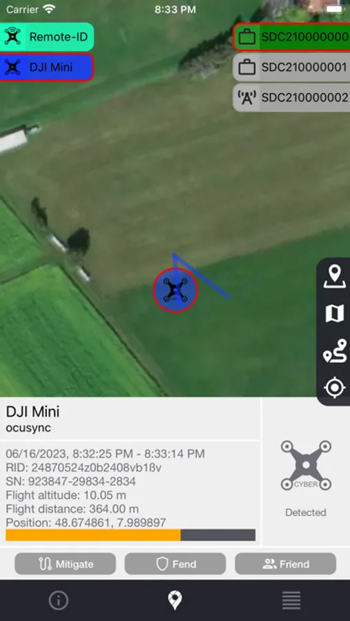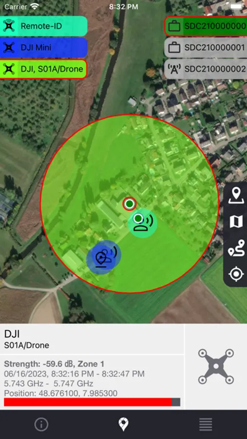 With the SecuriDrone app, drone detections are visualized live. The type of drone, its identification (serial number/remote ID), trajectory, distance, altitude and speed as well as the position on various maps are displayed. Almost in real time. A bonus – for example for law enforcement – is the recording function of the flight data. These can later be handed over to authorities, for example, as evidence. Regardless of the location, the app can connect to the SecuriCloud or directly to the SecuriDrone systems via WLAN.