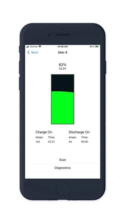 When connected to your Uno Battery, you will be able read diagnostics from it with ease using Bluetooth technology. You will be able to stay informed about the state of your battery with data including things like its battery percentage, temperature, and the amount of time until it is fully charged. Become an elite battery manager by knowing your devices total voltage, cell voltages, charge current, and more!