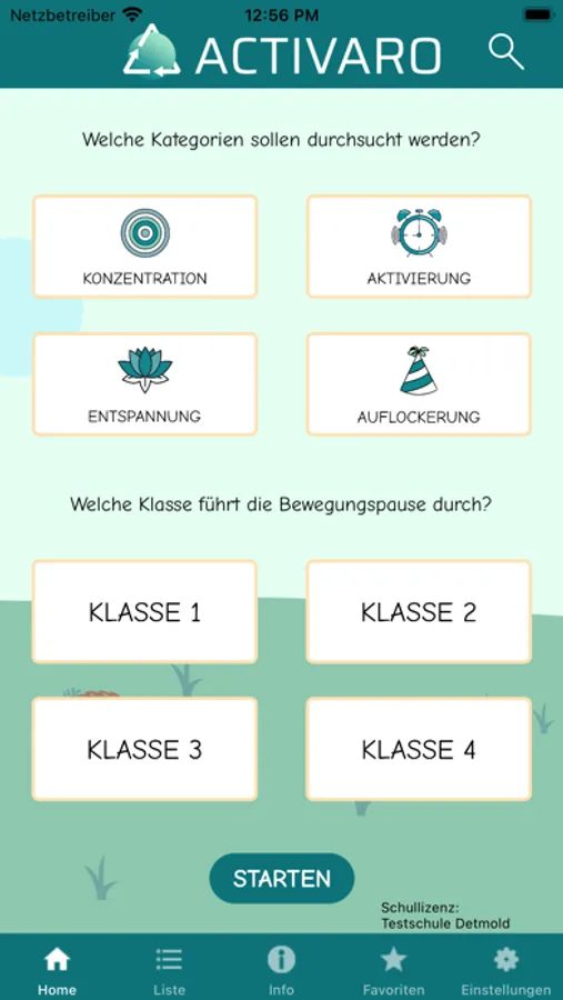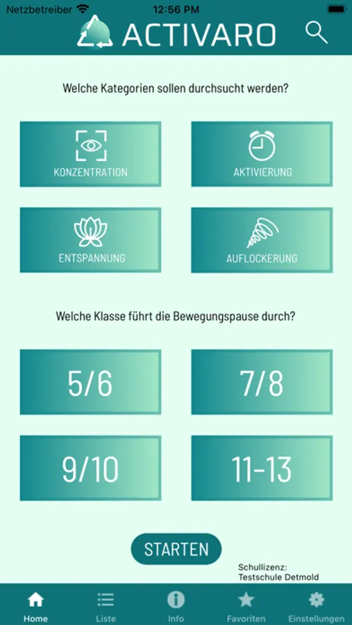Bewegungspausen können als Belastungsausgleich zum vorwiegend sitzend absolvierten Schulalltag dienen. In der ACTIVARO-App können Nutzerinnen und Nutzer Übungen nach vier Kategorien filtern. Ein Wechsel zwischen den verschiedenen Schwerpunkten wird empfohlen.