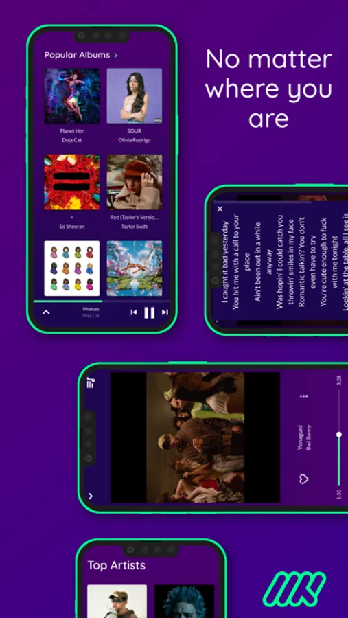 Listen in order or shuffle, skip songs, create your own playlists and sing along to your favourite artists lyrics. There are no limits.