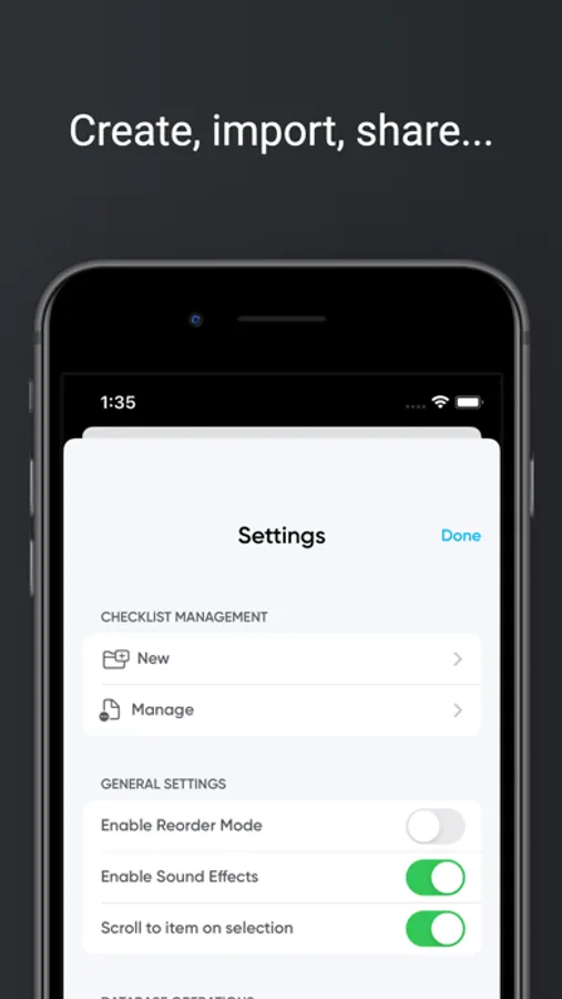 • The app never collects your data. Your data is yours. Always. Your checklists will never leave your device unless you want to share.