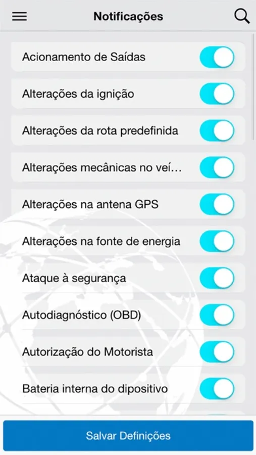 - Notificações push personalizadas, onde o próprio usuário escolhe quais tipos de alerta deseja receber através de push. São 30 categorias de alertas disponíveis ao usuário, dentre eles: alteração de ignição, limite de velocidade violado, ataque a segurança, pânico, entre outros.