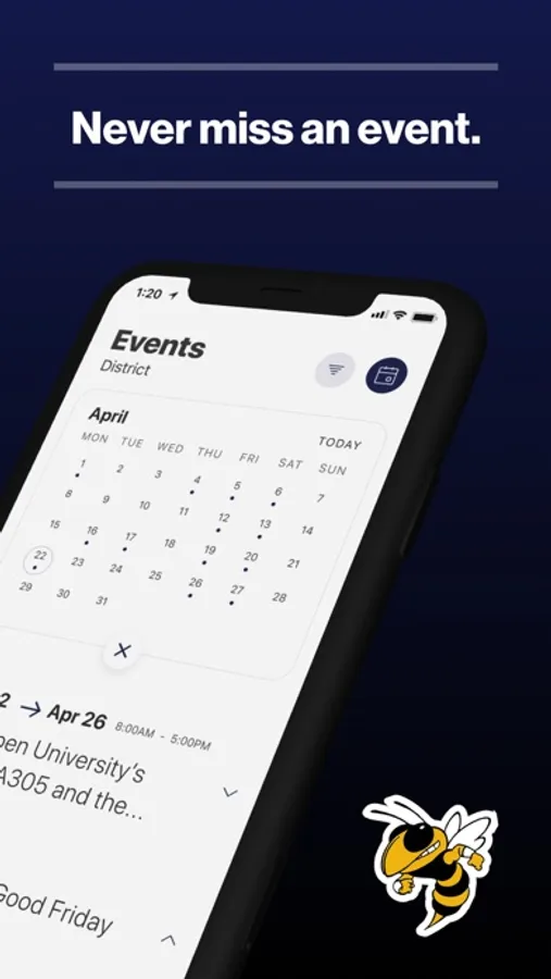 The event section shows a list of events throughout the district. Users can add an event to your calendar to share the event with friends and family with one tap.