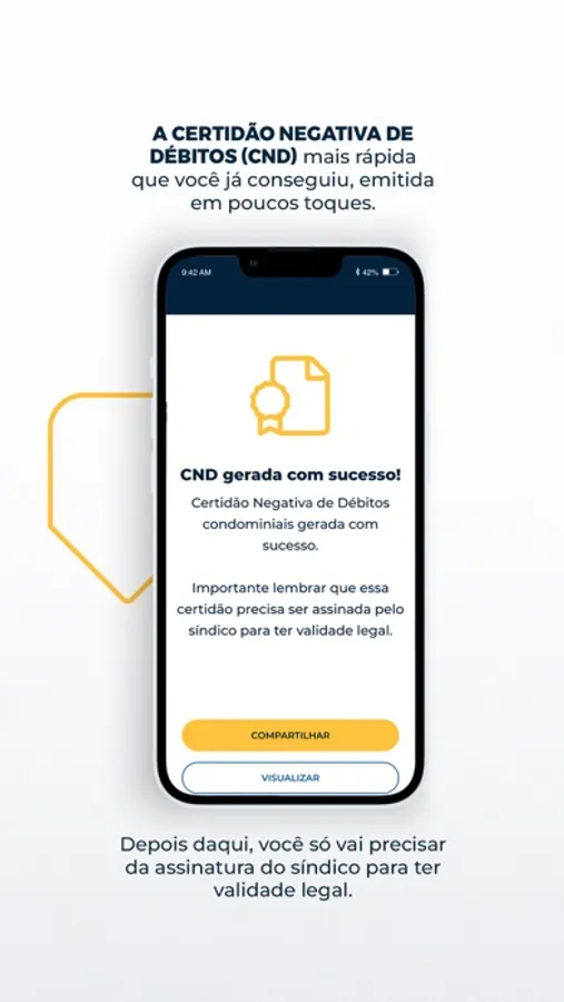 • Certidão negativa de débitos: sua CND emitida em poucos toques de tela para facilitar o dia a dia. Depois, é só pegar a assinatura do síndico para ter validade legal.