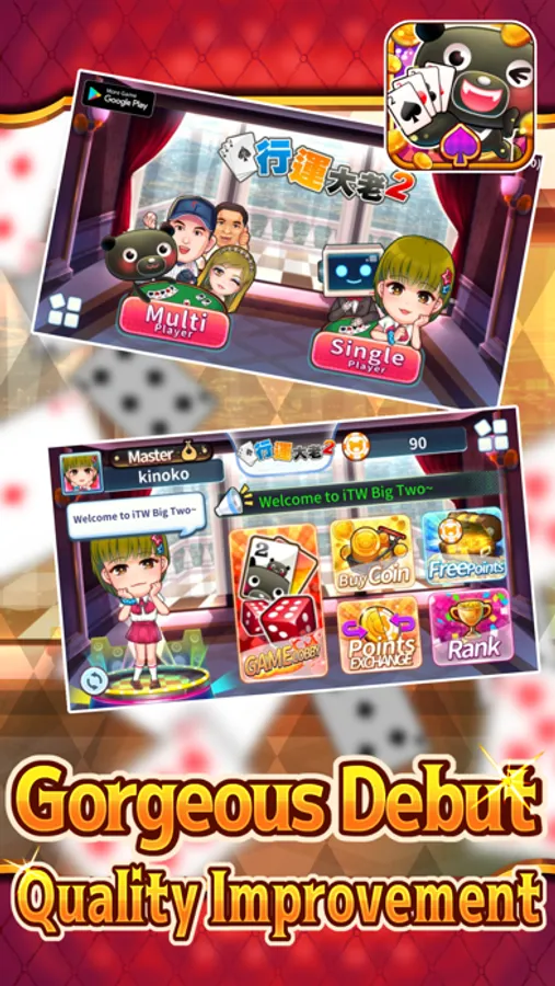 "Taiwan Big2" allows you to fight with your friends while online mode and practice in offline mode. Mobile phone classic poker game.