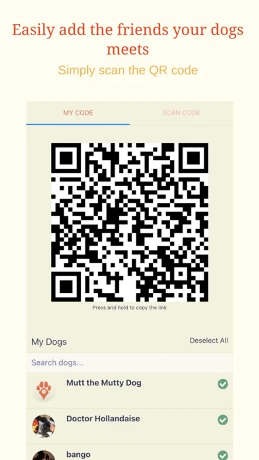 * Easily connect with dog friends via QR code