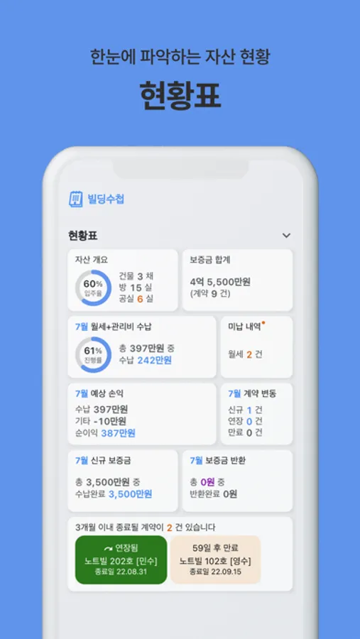 임대인이 입력한 정보를 토대로, 자산 정보와 임대 현황을 요약하여 보여주는 현황표가 제공됩니다. 또한 캘린더를 이용하면 월별 수납 현황을 한눈에 파악할 수 있습니다.